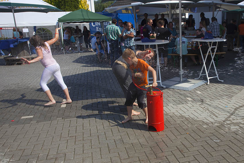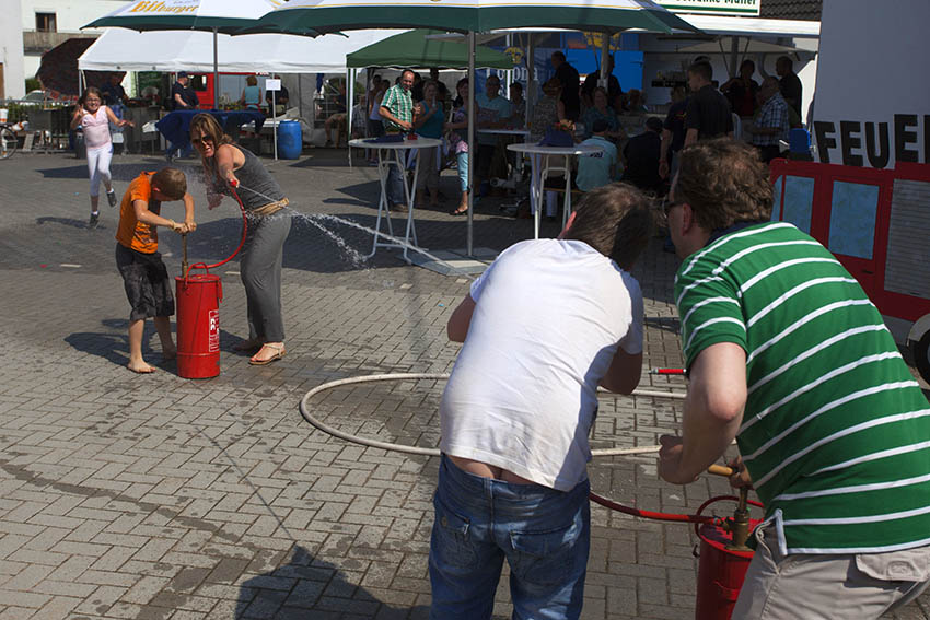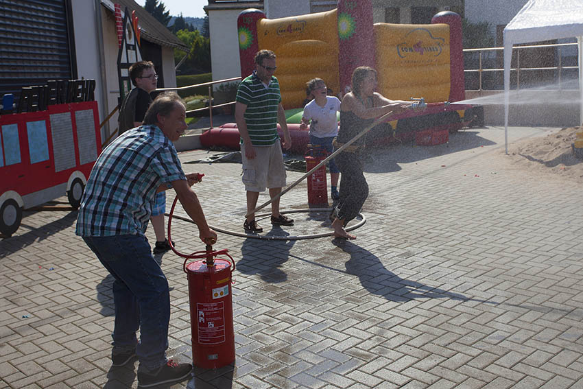 Am Sonntag hatte die Wehr schon früh ihre Tore geöffnet und die Besucher konnten sich in aller Ruhe umsehen. Auf dem großen Hof hatte ein LKW einen riesigen Haufen Sand abgekippt. Die Wehr hatte darüber ein offenes Zelt aufgestellt und der Nachwuchs nahm das Angebot und das bereit gestellte Spielzeug nur zu gerne an. Links und rechts vom Sand konnte gehüpft und geklettert werden. Bei Sonnenschein und heißen Temperaturen kamen am Nachmittag viele Besucher aus nah und fern und genossen den leckeren Kuchen oder Gebrutzeltes vom Grill. Am Gefragtesten waren die kühlen Getränke.