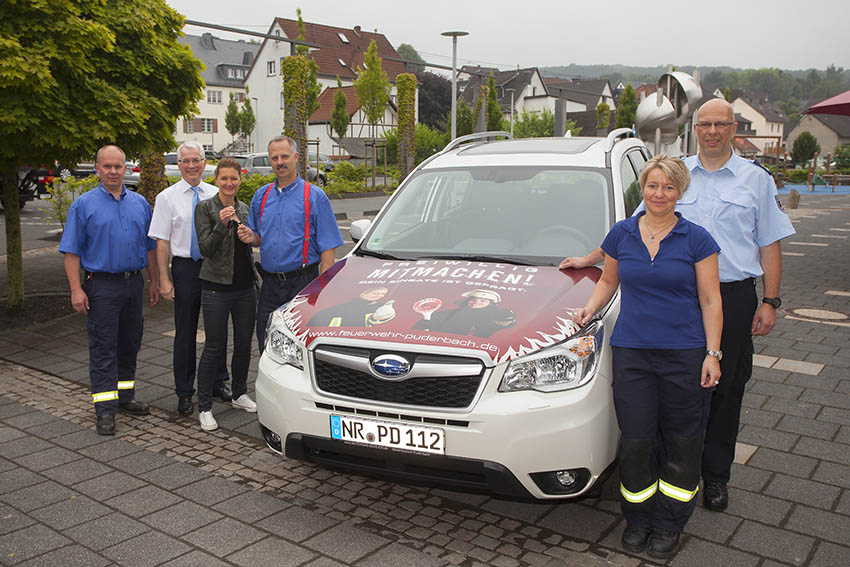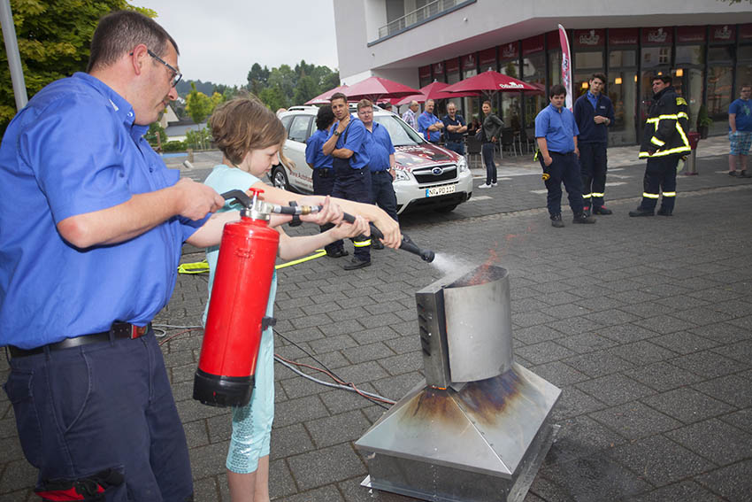 Die letzte der drei Themenreihen der Feuerwehr Puderbach war der Brandschutz im Haushalt. Die Wehrleute hatten dazu in der Puderbacher Ortsmitte ihr Equipment aufgebaut. Bevor es richtig losging, gab es bereits ein tolles Geburtstagsgeschenk. Das Puderbacher Autohaus Schlich sponsert einen SUV, der der Feuerwehr uneingeschränkt zur Verfügung steht. Nur tanken muss die Wehr selbst.