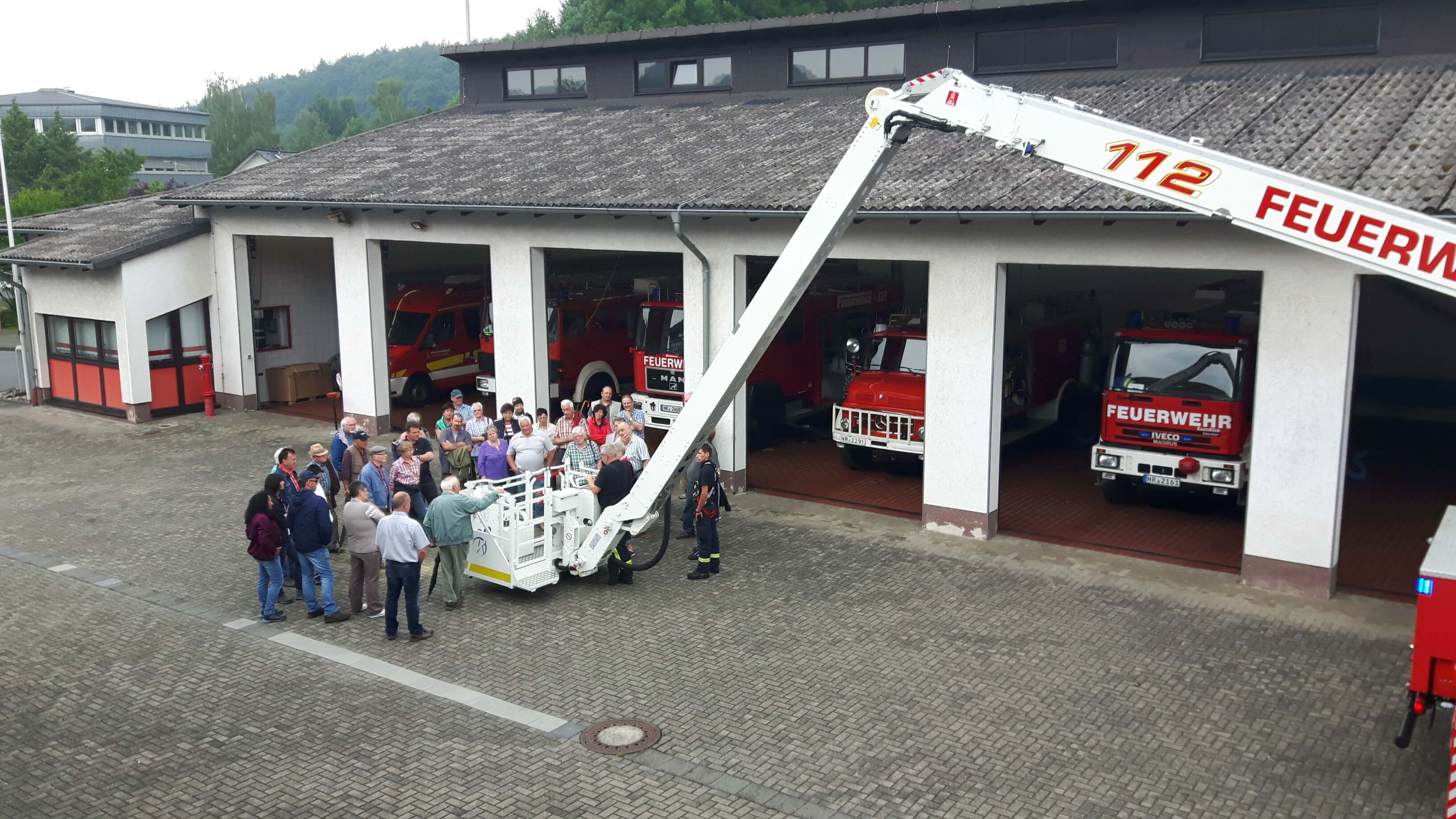 Von ganz besonderem Interesse war die Vorführung des kürzlich neu angeschafften Hubarbeitsbühne. Zwei extra für dieses Fahrzeug ausgebildete Feuerwehrkräfte führten vor, was in Sachen Feuerbekämpfung und Menschenrettung in luftiger Höhe mit Hilfe dieses Gerätes möglich ist. Ganze 32 Meter beträgt die maximale Armlänge des Auslegers, der komplett ferngesteuert werden kann. Alle Teilnehmer waren sichtlich beeindruckt von dem, was das Fahrzeug und insbesondere die freiwilligen Helfer, die dieses High-Tech-Gerät bedienen, zu leisten im Stande sind.