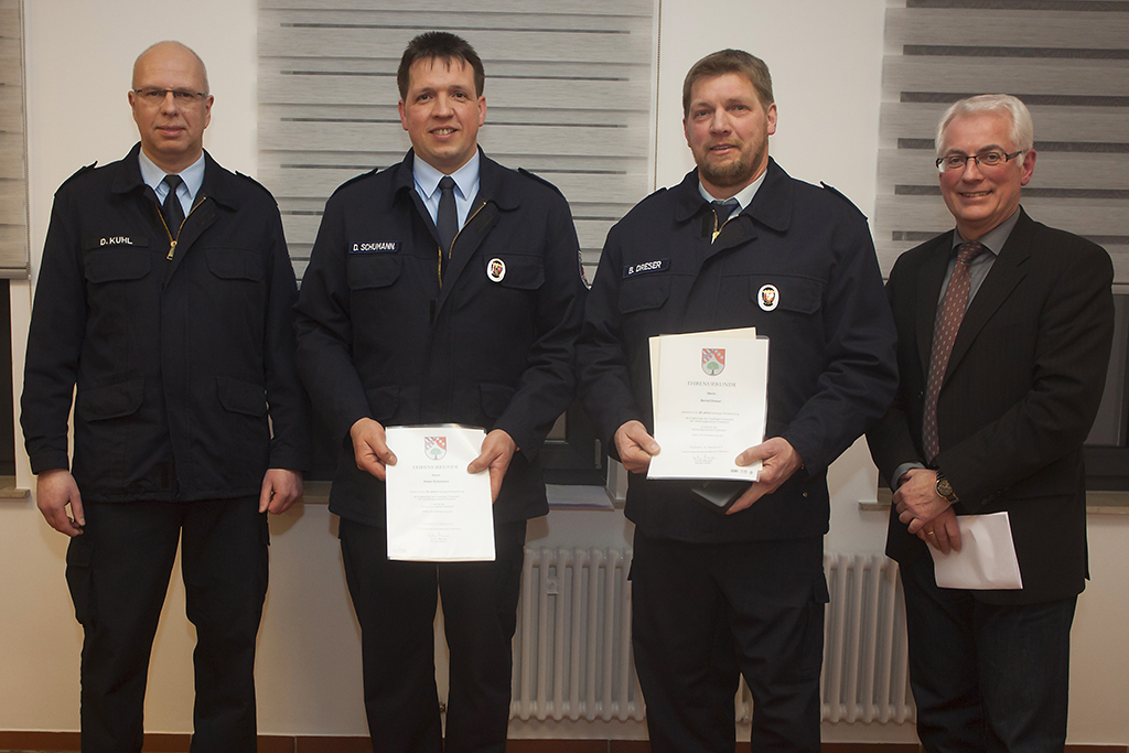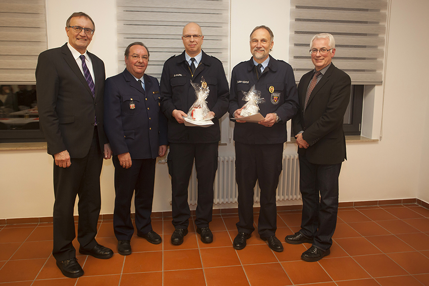 Für 25 Jahre Dienst für die Freiwillige Feuerwehr wurden der stellvertretende Wehrführer Dieter Schumann und Oberfeuerwehrmann Bernd Dreser von Bürgermeister Volker Mendel geehrt.