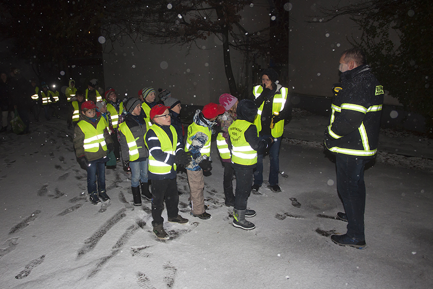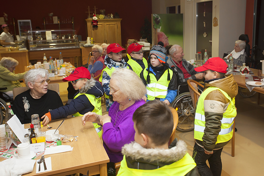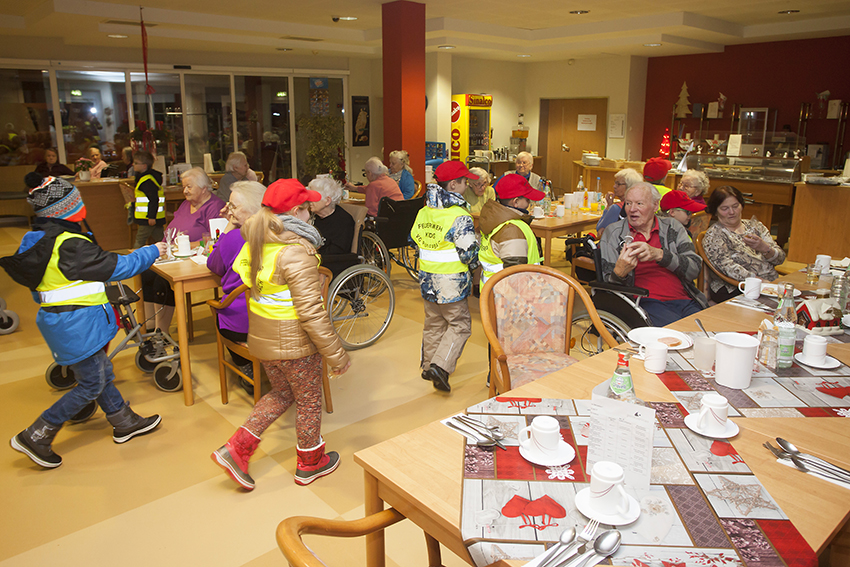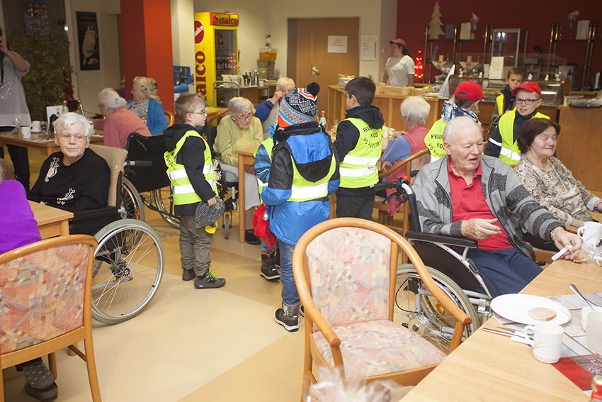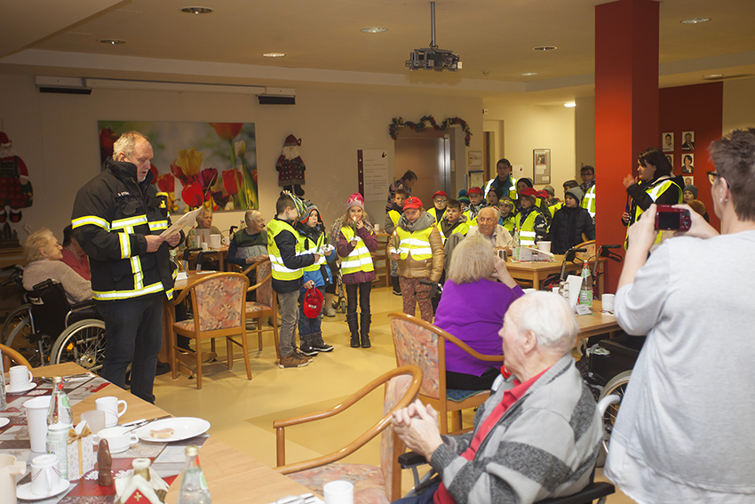 Nachdem sich die Kids und das Betreuerteam im Feuerwehrhaus getroffen hatten, bekamen die Bambinis Warnwesten an und los ging es in Richtung Seniorenzentrum. Im Gepäck die selbst gebackenen Plätzchen und die kleinen selbst gebastelten Geschenke. Die Bewohner des Seniorenzentrums „Mühlenau“ freuten sich, als sie die 27 Kinder sahen. Dieter Stein trug eine kleine Geschichte vor, bei der vier Kinder mit jeweils einer Kerze assistierten. Gemeinsam sangen die Bambinis das Lied von der Weihnachtsbäckerei und der eine oder andere Senior stimmte mit ein.
