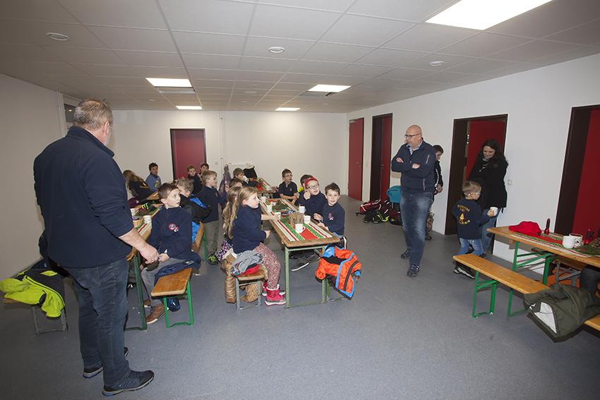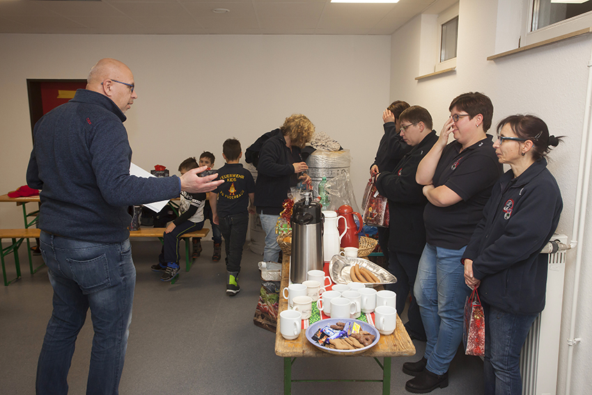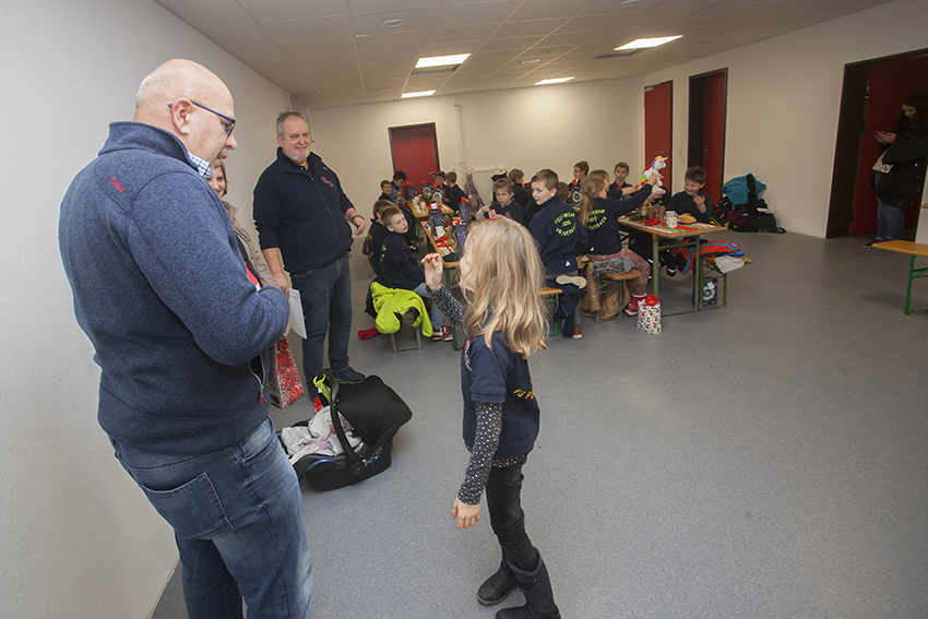 Jetzt ging es zurück ins Feuerwehrhaus. Dort hatten fleißige Hände Tische und Bänke, samt schöner Dekoration aufgebaut. Kakao war gekochte und Würstchen warm gemacht. So konnten sich die „Nachwuchs-Feuerwehrkameraden“ erst einmal stärken. Wehrleiter Dirk Kuhl war gekommen und ließ sich von den Bambinis von der Suche berichten. Er dankte, wie auch Dieter Stein, dem Betreuerteam für die in 2017 geleistete Arbeit. Nicht nur die Kinder erhielten eine Tüte mit Geschenken, auch das Betreuerteam und natürlich Dieter Stein.